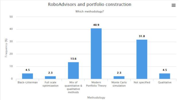 The algorithms used by these robo-advisor companies are proprietary, but most robo-advisors use Modern Portfolio Theory in their calculations. Raffaele Zenti collected data from around 50 robo-advisors and summarized his findings in the following chart taken from his LinkedIn blog post.